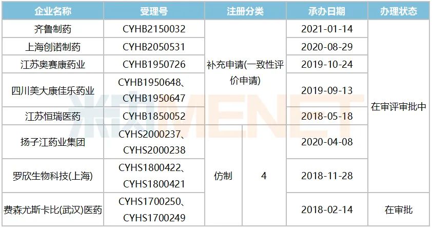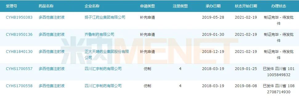 四川汇宇制药的多西他赛注射液4类仿制上市申请在2019年获批视并同过评,随后一年都无其他企业过评;2021年2月,正大天晴、齐鲁、扬子江的一致性评价补充申请密集获批,作为领军企业的恒瑞终于在3月拿下批件,齐鲁也多了一个规格过评,该产品已形成“原研+5仿制”局面,被纳入第五批国采是大概率事件。