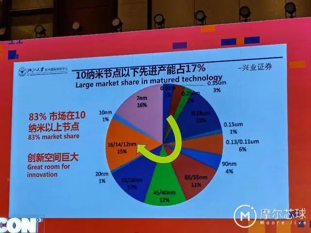 吴汉明院士同时还指出,如下图所示,现在83%以上的芯片产能集中在10纳米以上节点,为此在他看来,在这些所谓的旧节点上,还有很大的创新空间。