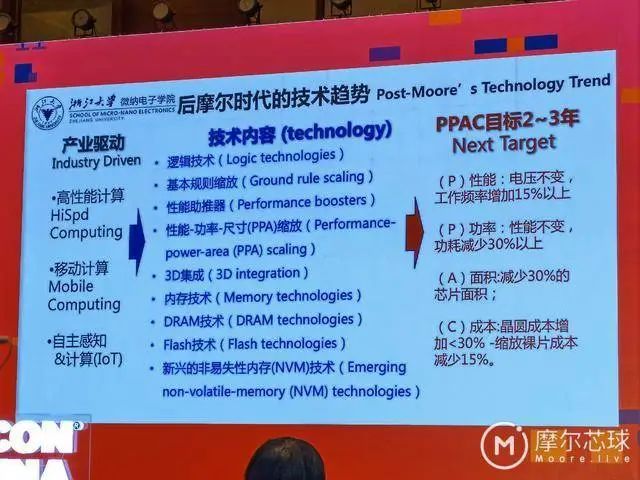 他强调,如下图所示,在后摩尔时代,在高性能计算、移动计算和自主感知等应用的推动下,我们应该增加对逻辑技术、基本规则缩放、性能助推器、PPA缩放、3D集成、内存技术、DRAM技术、Flash技术和新兴非易失存储技术的关注,已达到如下图所示的PPAC目标。