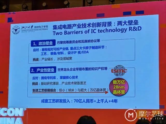 早前,SEMICON China在上海隆重举行,在同期高峰论坛上,中国工程院院士、浙江大学微纳电子学院院长吴汉明发表了题为《关于我国芯片制造的一些思考》的演讲。他首先指出,集成电路产业正在面临两大壁垒,分别是政策壁垒和产业性壁垒,其中政治壁垒包括大家都知道的巴统和瓦森纳协议,而产业性壁垒则体现在世界的半导体龙头得益于早期布局,所积累的丰富知识产权,这些都给中国半导体提出了巨大的挑战。他举例说道,一个成套工艺研发,要投入70亿人民币,要上千人工作四年,才能完成,由此可以看到集成电路行业的难。