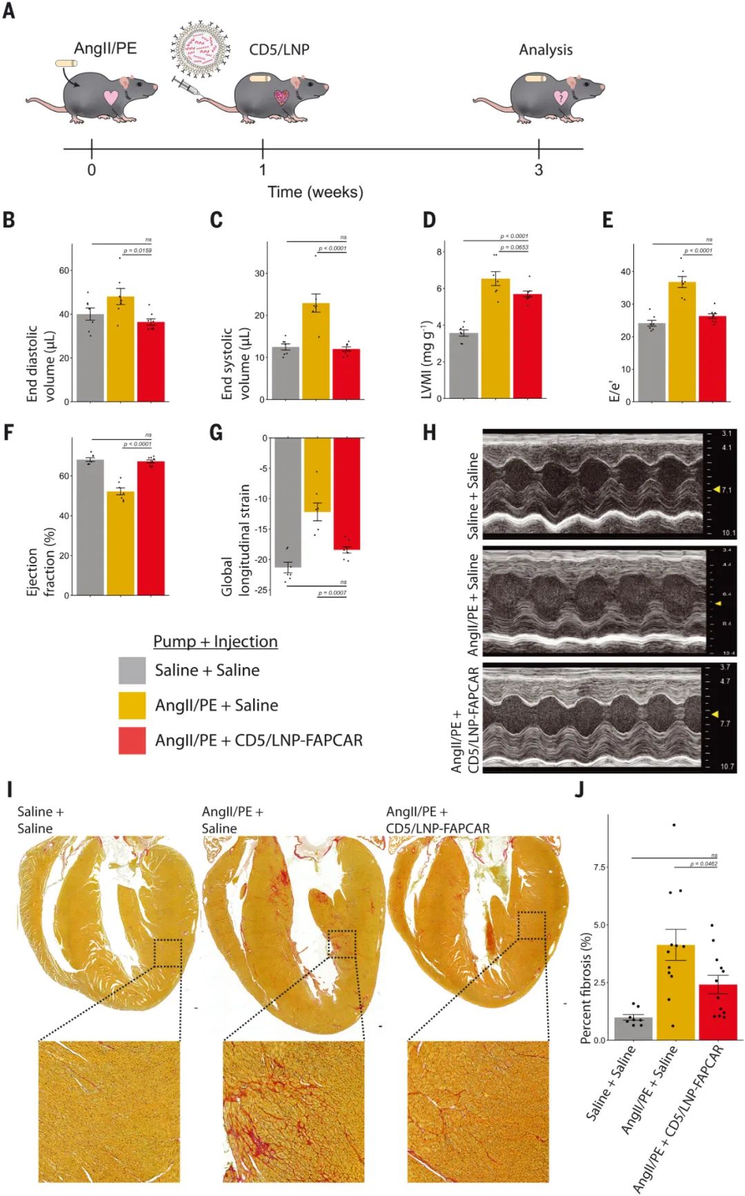 研究团队开发了一种在体内生成的瞬时工程化 CAR-T 细胞疗法,通过注射脂质纳米颗粒(LNP)递送的 mRNA,重编程T细胞,使其识别心脏纤维化细胞,进而减少纤维化,恢复心力衰竭小鼠模型的心脏功能。
