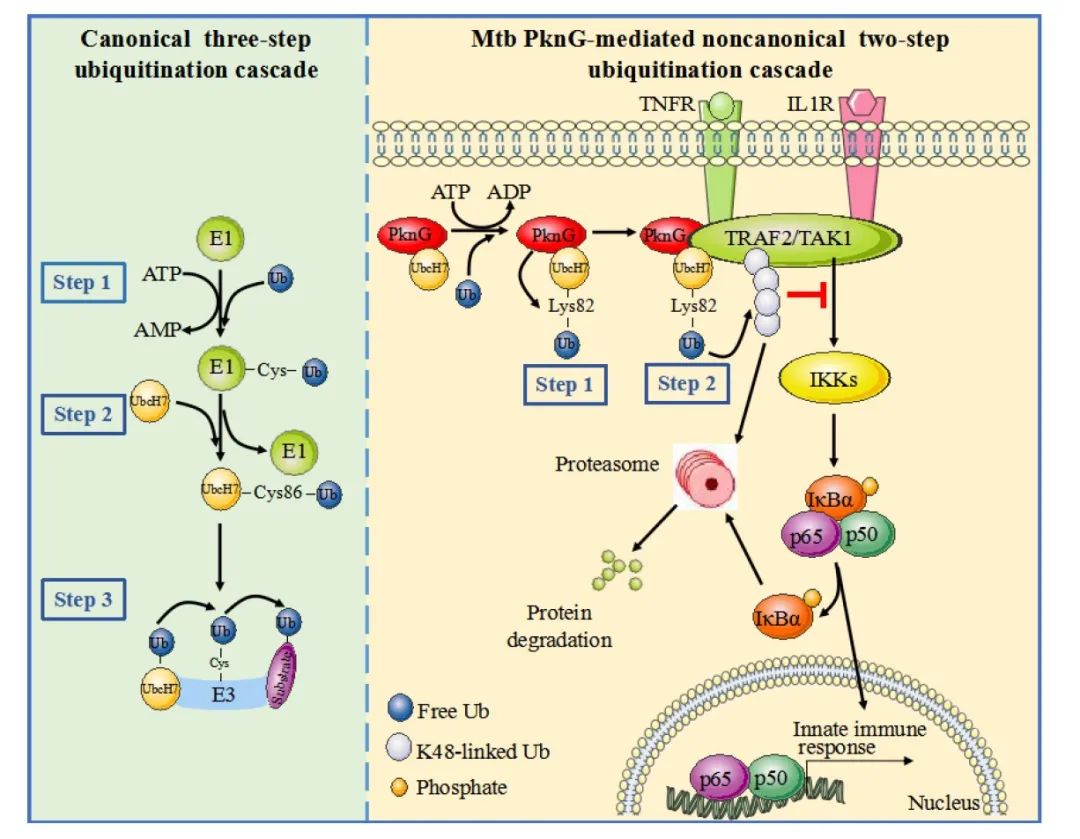 图1. Mtb PknG利用其非经典泛素化酶活性抑制宿主天然免疫反应的模式图