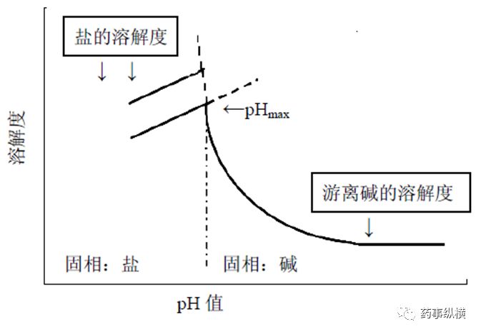 图2. 弱碱化合物的游离碱形式和盐的pH溶解度关系