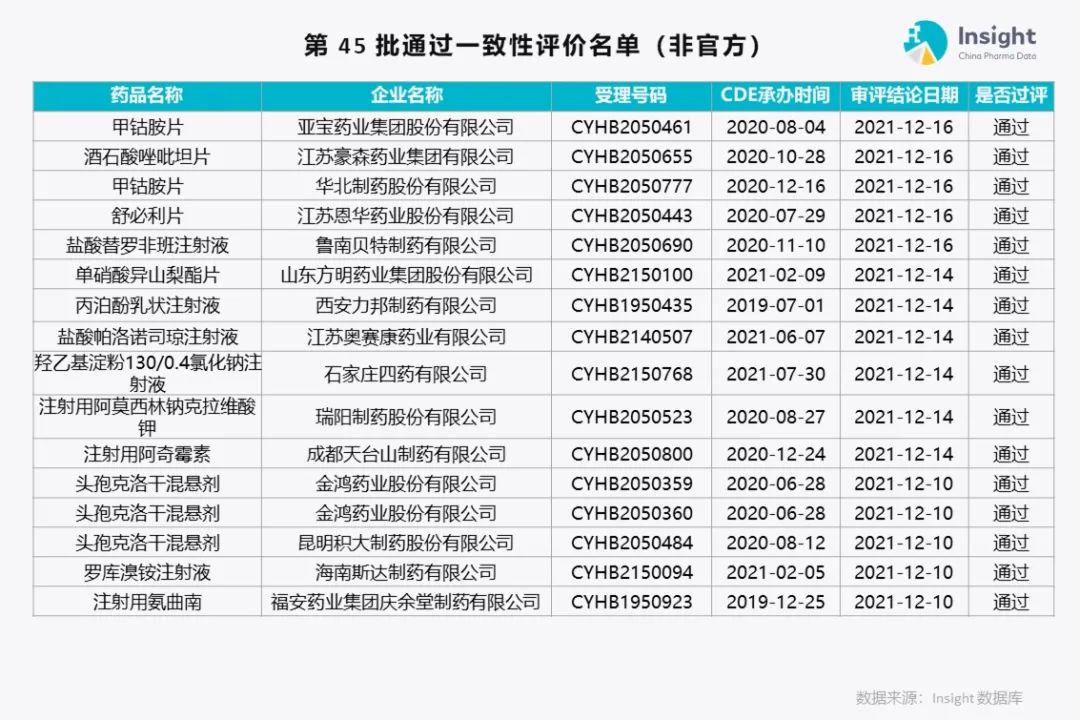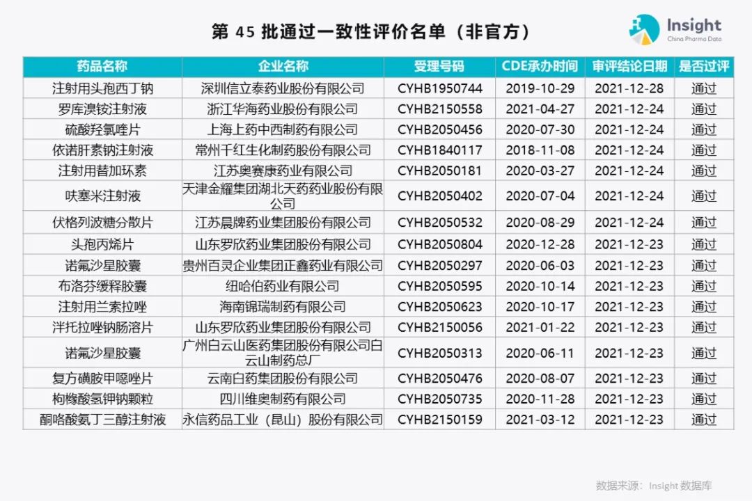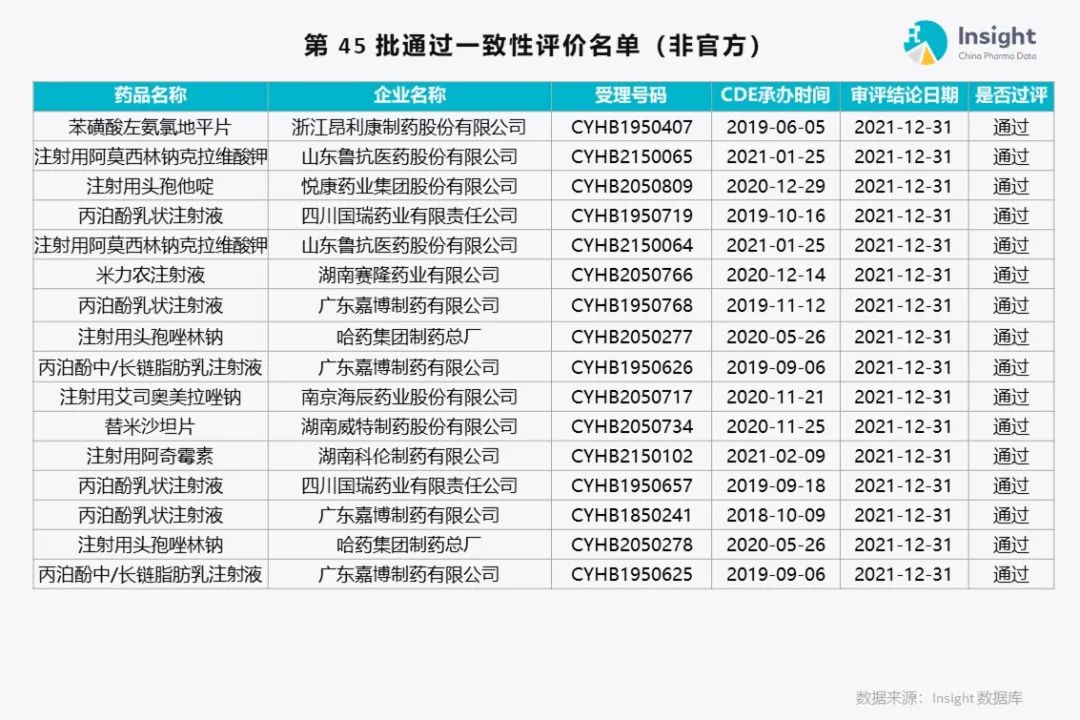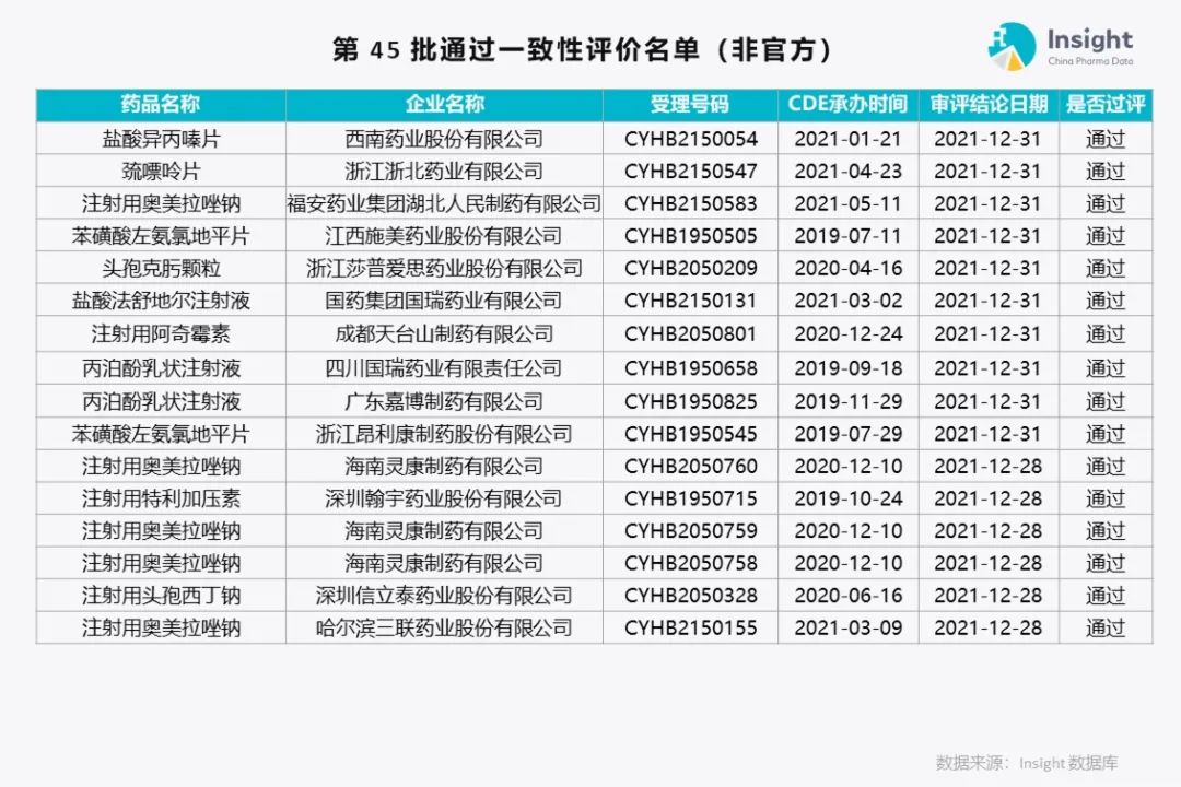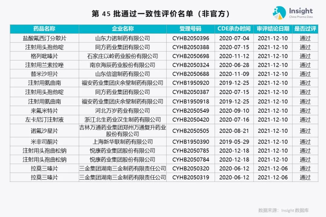 Insight 数据库(https://db.dxy.cn)独家整理了第 45 批通过一致性评价的品种名单,共 159 个受理号。
