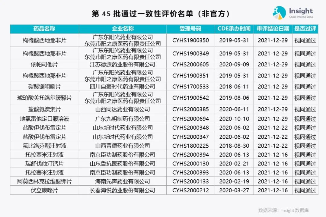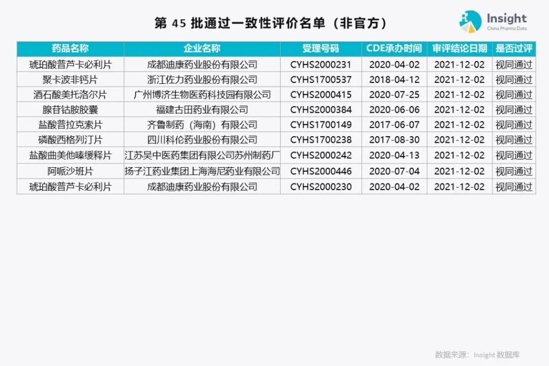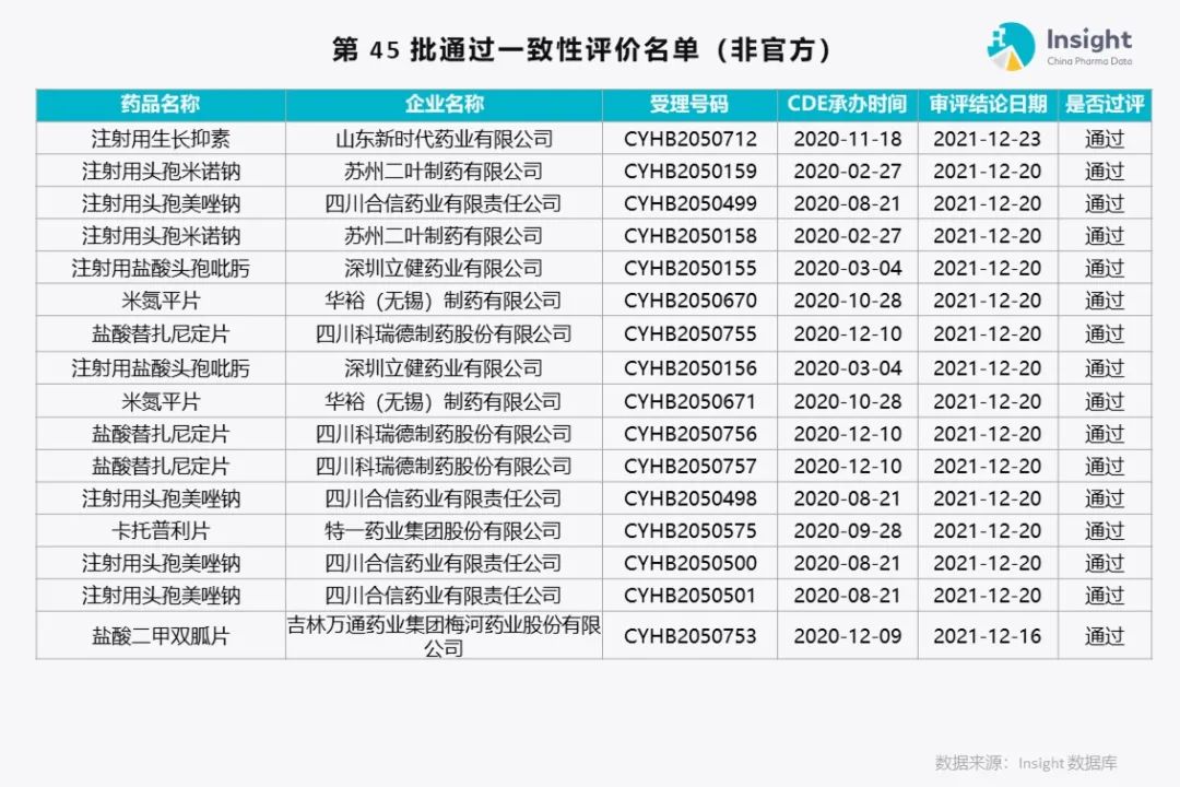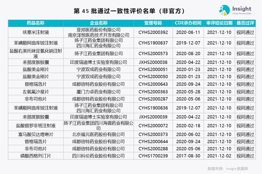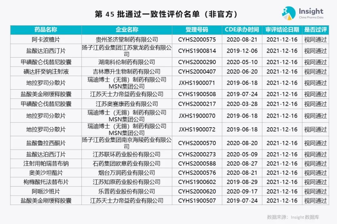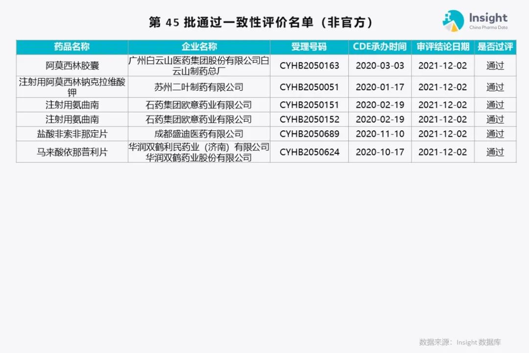 Insight 数据库(https://db.dxy.cn)独家整理了第 45 批通过一致性评价的品种名单,共 159 个受理号。