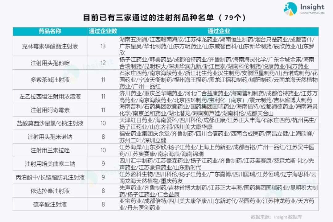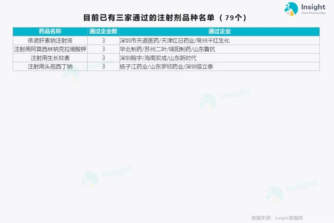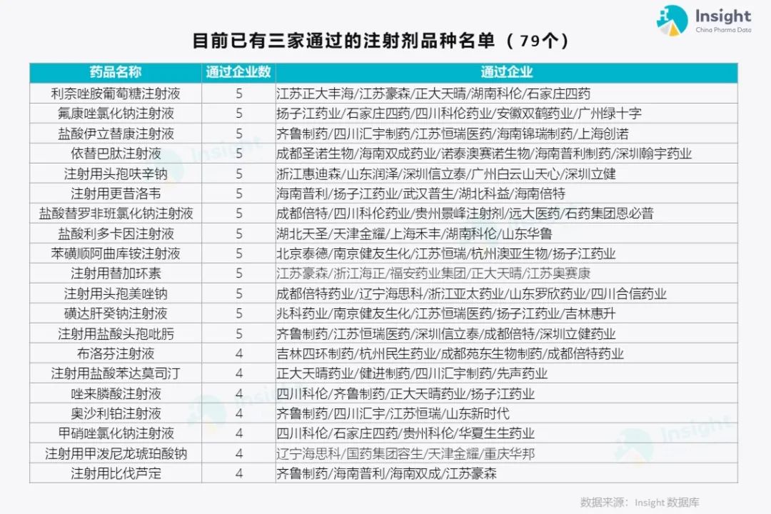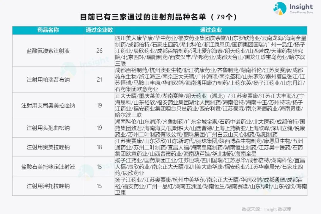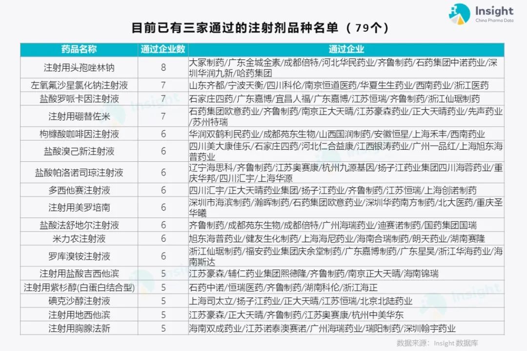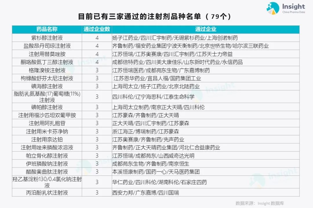 Insight 数据库(https://db.dxy.cn)统计,一致性评价品种通过企业达 3 家的品种已经有 292 个,其中注射剂品种 79 个。
