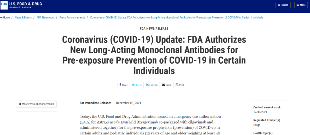 3.Evusheld (AZD7442) long-acting antibody combinations are authorized for emergency use in the United States for pre-exposure prophylaxis of neo-coronary pneumonia (COVID-19).