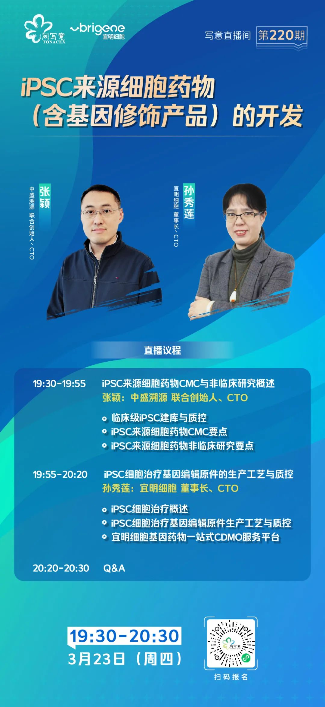 为此,3月23日(周四)晚上19:30,写意直播间邀请中盛溯源联合创始人、CTO张颖和宜明细胞董事长、CTO孙秀莲分享“iPSC来源细胞药物(含基因修饰产品)的开发”。敬请关注。