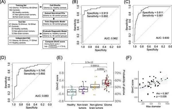 研究团队通过采集检测者静脉血浆,构建了包括 180 名胶质瘤患者和 229 名非胶质瘤人群对照组的数据集,发现 cfDNA 羟甲基组和潜在胶质瘤的异常转录之间存在显著一致性。功能分析揭示,致癌和神经通路中差异羟甲基化基因(DhmGs)存在过度表达。在将数据集区分为训练队列和测试队列后发现,测试集(AUC=0.962)以及由 111 名胶质瘤患者和 111 名非胶质瘤人群对照组组成的独立数据集(AUC=0.930)中,用训练集 DhmGs 构建的逻辑模型可将胶质瘤患者区分开来。