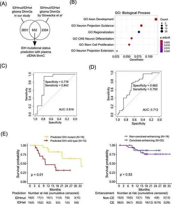 此外,具有突变型和野生型异柠檬酸脱氢酶(IDH)的胶质瘤之间的 DhmGs 可用于训练基础肿瘤 IDH 突变状态的 cfDNA 预测因子(AUC=0.816),从研究结果来看,预测 IDH 突变型胶质瘤患者的预后明显更好(p=0.01)。