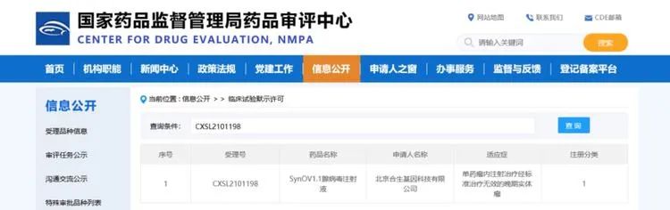 2021年10月11日,北京合生基因科技有限公司(以下简称合生基因)研发的首款基因治疗产品——用于治疗晚期实体瘤的溶瘤病毒产品SynOV1.1腺病毒注射液获得国家药品监督管理局(NMPA)临床试验默示许可,这也是国内首个“合成基因线路精准调控”的基因治疗产品获得国家药监局批准开展临床试验。
