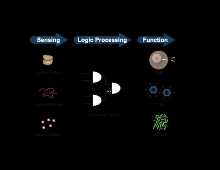 合成基因线路是指由一些基本生物元件构成的人工基因网络,可在活细胞中感受、整合、处理分子信号,自动地执行特定的生物功能。装载合成基因线路的基因与细胞产品可以响应特定的疾病生物标志物或其他控制信号(光、热、声等),特异性靶向异常细胞和病灶区域、表达、释放治疗药物,使治疗更智能、可控。合成基因线路将引领新一代基因与细胞疗法的开发。