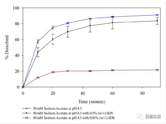 研究中发现,在含有低于CMC浓度的SDS的pH4.5介质中形成了不溶性盐,影响了药物的溶解度和制剂的润湿性,而在高pH时这种现象不明显。pH4.5介质中,当SDS浓度高于CMC浓度时,其溶出也比不加SDS的情况慢。
