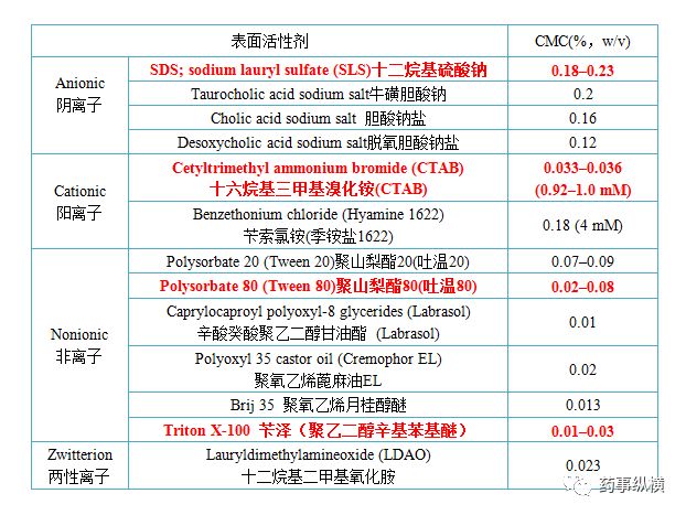 如果上述条件都不合适,可以考虑采用加入表面活性剂,此时应查询国内外文献、专利、质量标准,并结合药物结构选择表面活性剂的种类。筛选时,应根据情况考虑涵盖所有常用种类的表面活性剂,比如阴离子型、阳离子型、和非离子型。USP<1092>中列举了多种商品化的表面活性剂及其临界胶束浓度(Critical Micelle Concentration,CMC)的近似临界值,在方法开发中可以参考。
