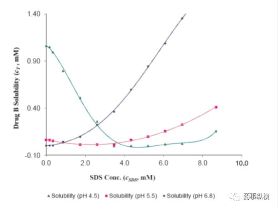 药物离子与表面活性剂之间的离子对相互作用在溶出介质中经常发生,可导致药物溶出不完全。本例中碱性药物B(pKa为4.9、5.6)在pH4.5以下溶解度很高,没有区分力,因此考察4.5以上的溶出情况,而由于在此范围内溶解度又很低,因此考虑加入SDS进行考察。