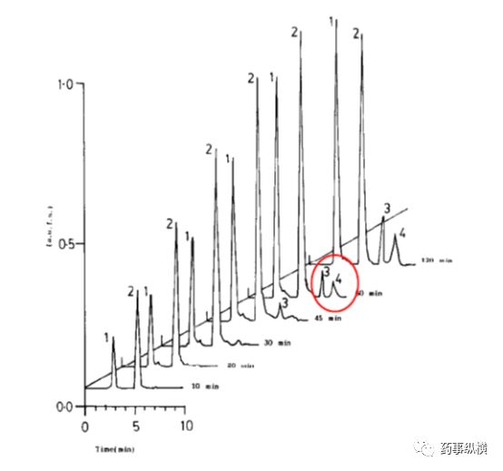 利福平在酸溶液中的降解情况(3、4为两个降解物峰)