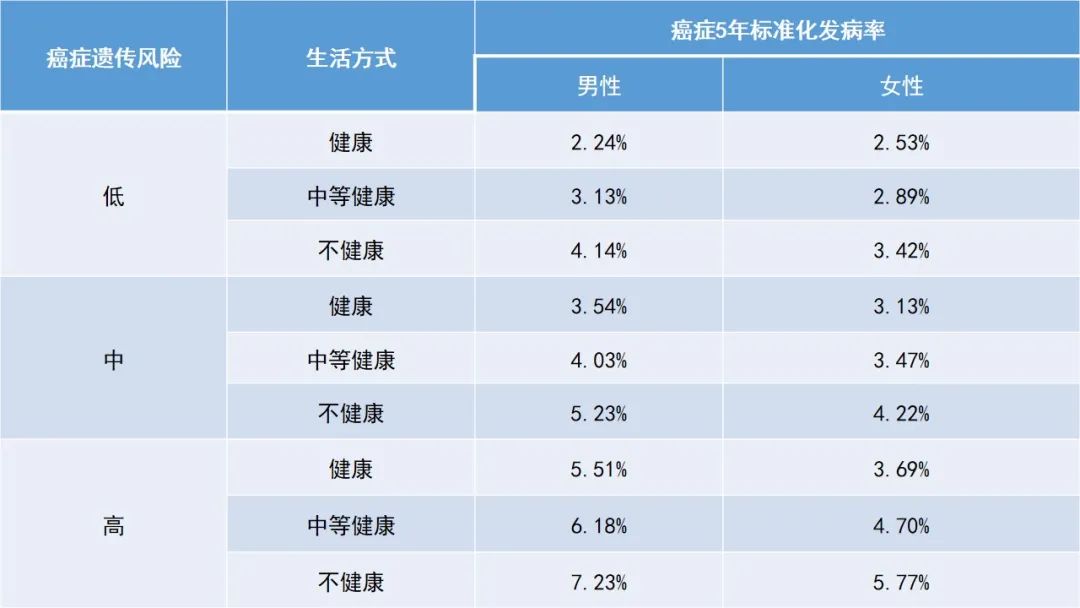 在男性中,相比于整体患癌症低遗传风险且生活方式健康的人群,整体患癌症高遗传风险且生活方式不健康,与整体患癌风险升高199%相关;而在女性中则为138%。