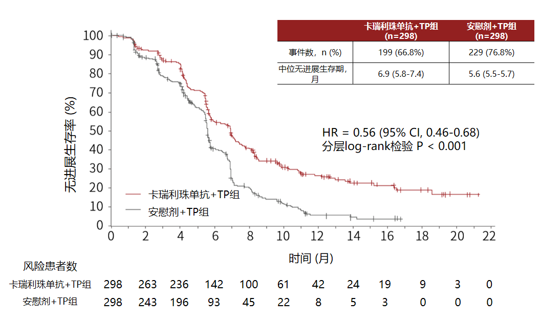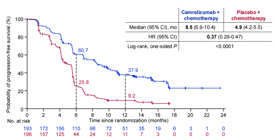 卡瑞利珠单抗组的由 BIRC 评估的 PFS 为 8.5 个月(95%CI 6.9-10.4),而安慰剂组为 4.9 个月(95%CI 4.2-5.5),HR 为 0.37(95%CI 0.29-0.47);