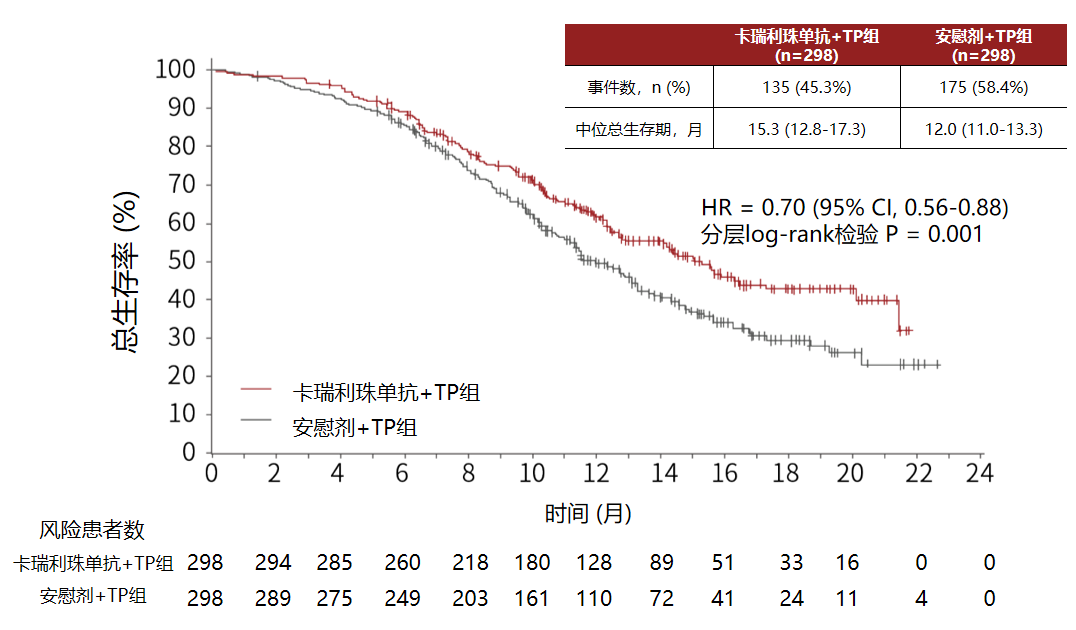 该项研究共入组 596 例受试者,按照 1:1 随机入组,分别接受注射用卡瑞利珠单抗(艾瑞卡®)联合紫杉醇和顺铂(TP 方案)或安慰剂联合 TP 方案,联合治疗不超过 6 个周期,之后接受注射用卡瑞利珠单抗(艾瑞卡®)或安慰剂维持治疗,直至疾病进展、毒性不可耐受或其他需要终止治疗的情况。