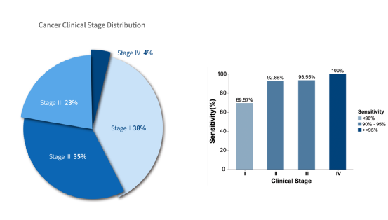 此次研究成果的先进性,还体现在覆盖更高比例的早期患者:I、II期患者样本总体占比高达 73%,而在I、II期样本检测中,灵敏度分别达到了69.6%和92.9%,检测性能显著优于国外头部早筛企业数据模型。