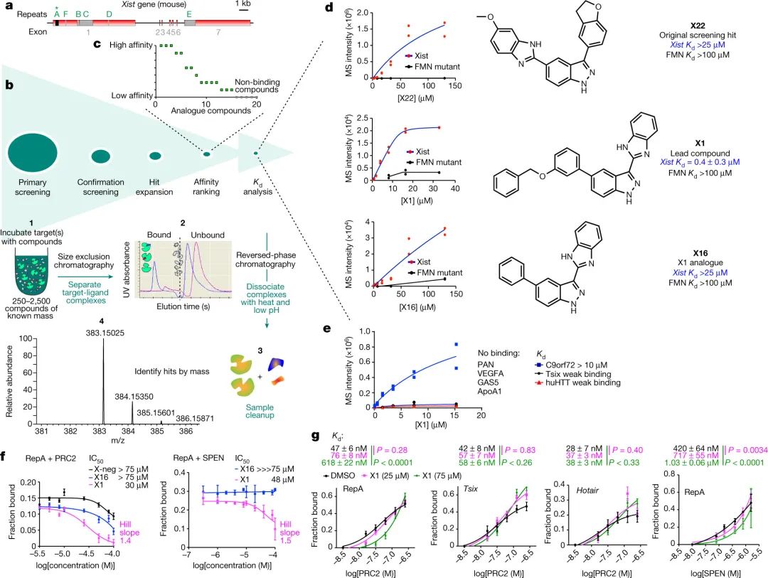 为进一步验证其筛选出的化合物 X1 对 RepA 功能的影响,该团队将 X1 与促进 Xist 传播、沉默 X 染色体的同源蛋白 RepA RNA、PRC2 以及 SPEN-RRM 的相互作用进行了检测。测试结果显示,在 X1 的作用下,RepA 与同源蛋白之间的相互作用逐渐受到影响(下图f)。并且,相互作用的希尔系数为 1.4-1.5,这表明 X1 在影响 RepA 功能过程中可能会发挥协同作用,即不止一个 X1 分子与 RepA 结合。