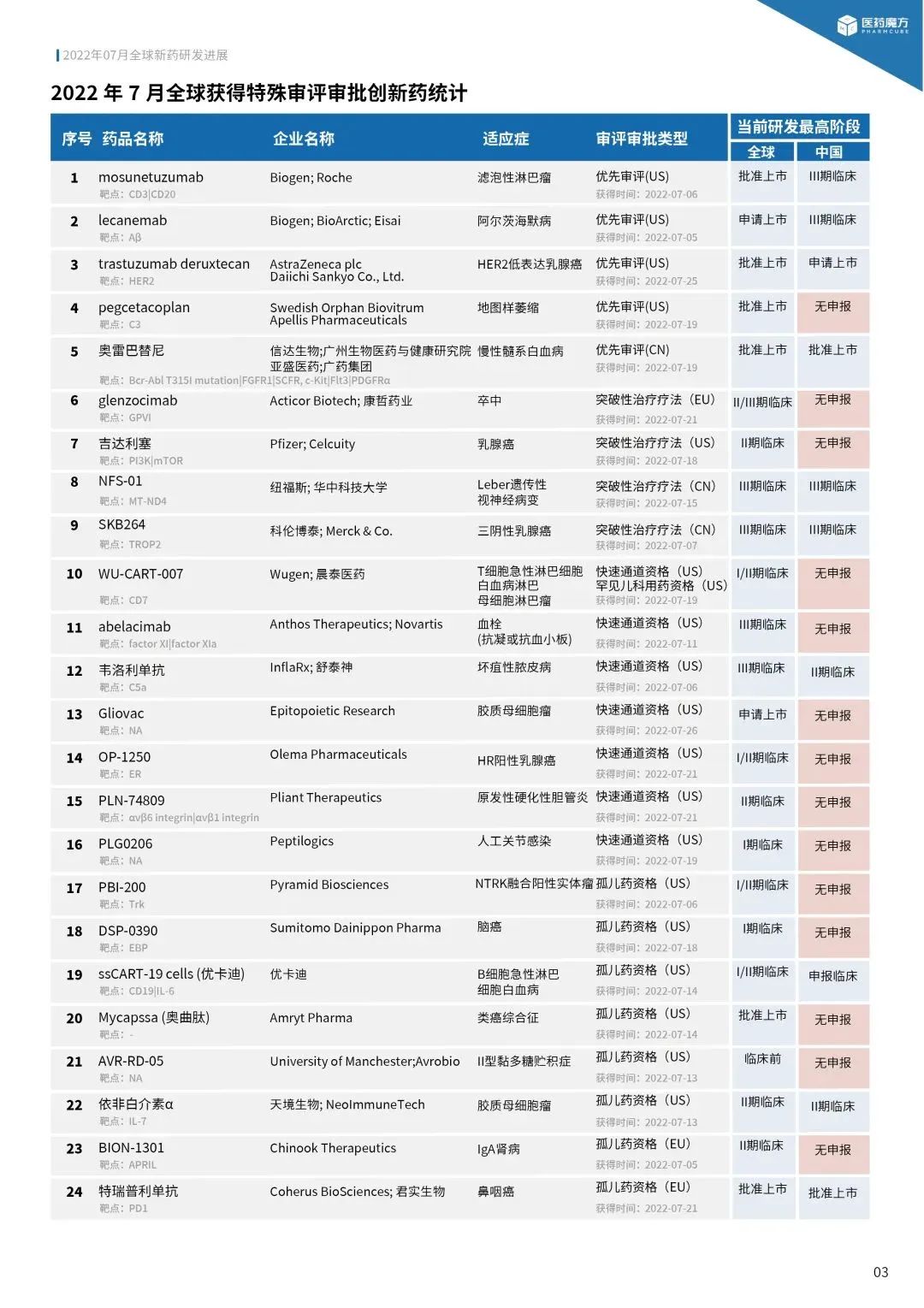 2)注册进展:突破性疗法,FIRST IN CLASS/BEST IN CLASS产品首次获批等信息。