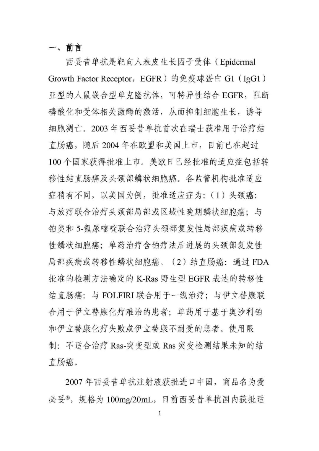 2003 年西妥昔单抗首次在瑞士获准用于治疗结直肠癌,随后 2004 年在欧盟和美国上市, 目前已在超过100 个国家获得批准上市。2007年西妥昔单抗注射液获批进口中国,商品名为爱必妥,规格为 100mg/20mL。
