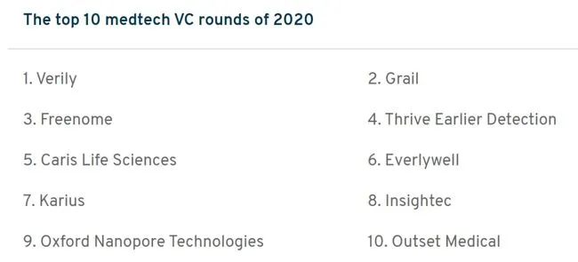 整个2020年,医疗技术公司共获得了64亿美元的风险投资,这一金额远高于2019年的57亿美元。排名前十的融资占据了总融资额的40%,而且,融资排名前十的公司中,半数为液体活检领域公司。