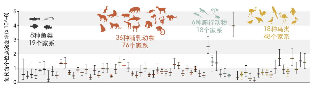 我们通过对涵盖哺乳动物、鸟类、爬行类和鱼类等68种脊椎动物323个家系的高深度基因组测序分析,利用我们建立起来的统一分析方法对每个物种新生突变的发生率进行了准确的测量,为理解新发突变发生率的种间差异提供了基础。