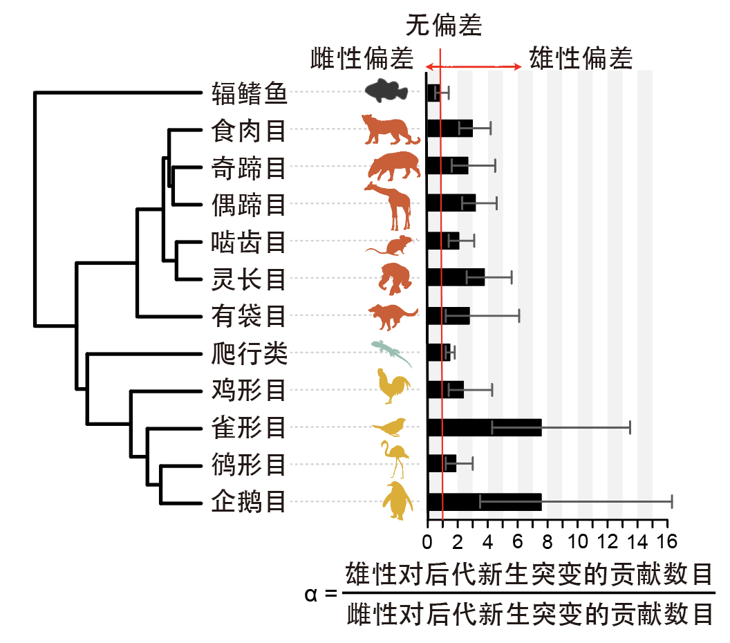 图注:相对于鱼类和爬行类,在鸟类和哺乳动物后代的新生突变中,雄性的贡献比例远超雌性。图片来源:张国捷团队供图
