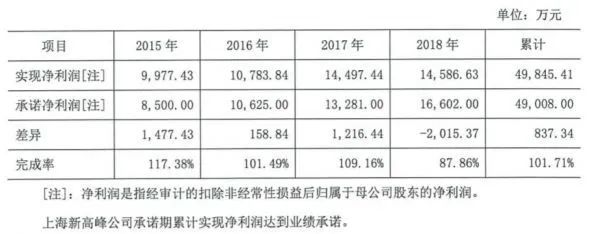 在收购时,上海新高峰曾和亚太药业签署业绩承诺:Green Villa承诺,上海新高峰于2015年-2018年实现的年度净利润数将分别不低于8500 万元、10625 万元、13281万元和16602 万元。交易对方实际控制人任军对交易对方作出的业绩承诺等承担连带责任保证。对于承诺的净利润完成率在2018年开始出现问题,上海新高峰的完成率只有87.86%。
