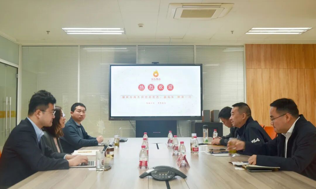 3月30日,湖州市商务局党委委员、副局长郎涛莅临火石创造调研交流,湖州市招商中心三部部长陈欢明、副部长卢丙成陪同。火石创造董事长金霞等进行了接待。