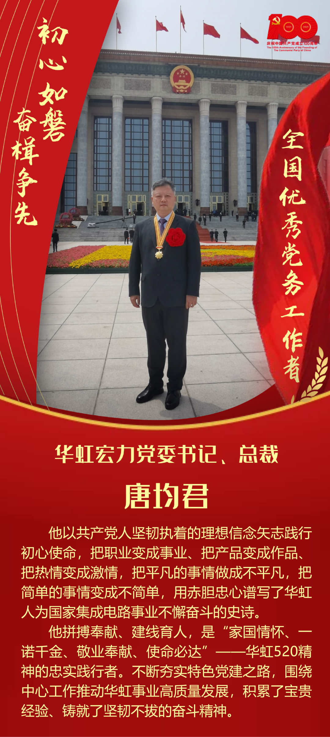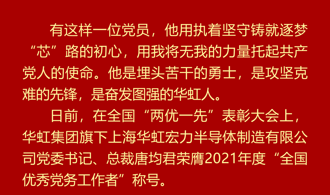 热烈祝贺!华虹宏力党委书记、总裁唐均君同志荣获2021年“全国优秀党务工作者”荣誉称号