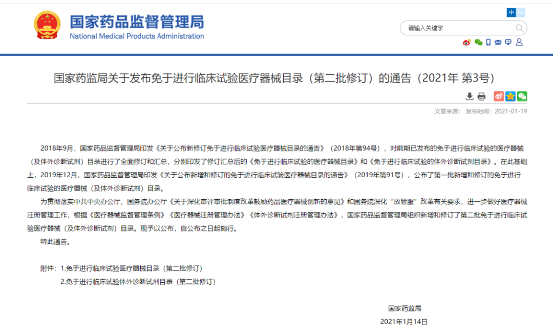 2018年9月,国家药品监督管理局印发《关于公布新修订免于进行临床试验医疗器械目录的通告》(2018年第94号),对前期已发布的免于进行临床试验的医疗器械(及体外诊断试剂)目录进行了全面修订和汇总,分别印发了修订汇总后的《免于进行临床试验的医疗器械目录》和《免于进行临床试验的体外诊断试剂目录》。在此基础上,2019年12月,国家药品监督管理局印发《关于公布新增和修订的免于进行临床试验医疗器械目录的通告》(2019年第91号),公布了第一批新增和修订的免于进行临床试验的医疗器械(及体外诊断试剂)目录。