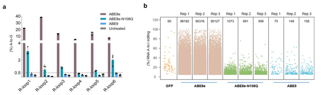 通过鉴定Cas9非依赖性脱靶的R-Loop检测以及RNA脱靶的转录组深度测序,发现ABE9几乎不引起随机的DNA和RNA脱靶编辑(图2),展示出了极高的应用安全性。