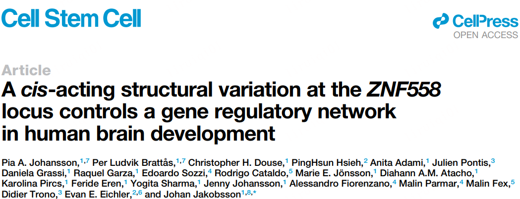 近日,来自瑞典隆德大学的Johan Jakobsson团队在Cell Stem Cell杂志上发表了一篇题为A cis-acting structural variation at the ZNF558 locus controls a gene regulatory network in human brain development 的文章,这项研究鉴定了一种在人类而非黑猩猩前脑祖细胞中表达的KZFP——ZNF558,其表达受可变数目串联重复序列(variable number tandem repeat, VNTR)的大小控制,从而调节线粒体自噬基因SPATA18的表达,影响人类大脑早期发育过程中的发育时间。这种VNTR序列在黑猩猩中更长,但在人类中更多变,这些发现可能提供了对顺式作用结构变异如何建立影响人类大脑进化的调节网络的机制见解。