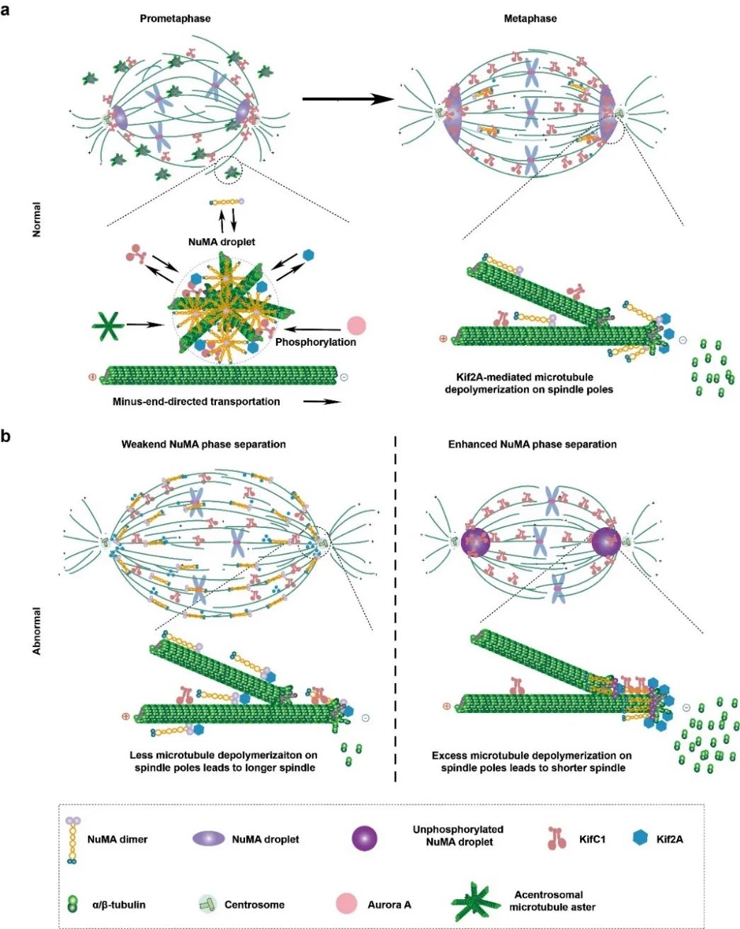 2021年12月9日,北京大学生命科学学院张传茂团队在Nature Communications杂志上发表了题为 NuMA regulates mitotic spindle assembly, structural dynamics and function via phase separation 的工作。该项工作发现纺锤体装配因子NuMA在有丝分裂期通过液-液相分离凝集到纺锤体极上,并将微管解聚蛋白Kif2A隔离到纺锤体极的区域进行有效的微管解聚,从而调控纺锤体的长度和动态性,这一过程受到了有丝分裂期激酶Aurora A的磷酸化调控。