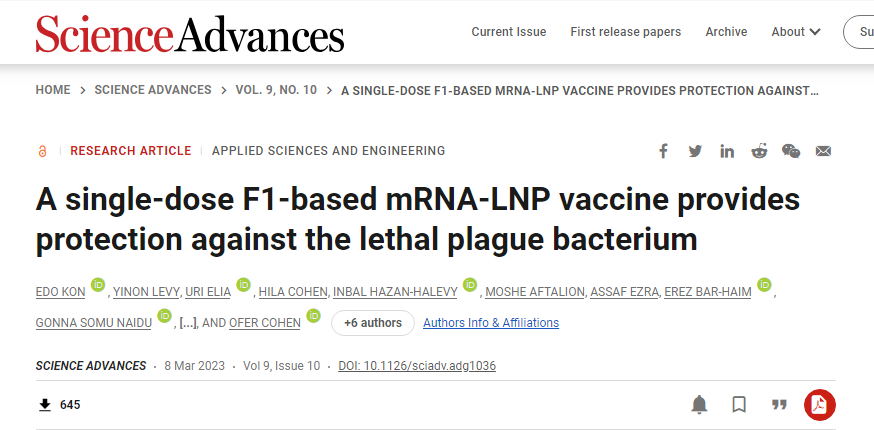 EDO KON,YINON LEVY,URI ELIA, et al. A single-dose F1-based mRNA-LNP vaccine provides protection against the lethal plague bacterium, Science Advances (2023). DOI:10.1126/sciadv.adg1036