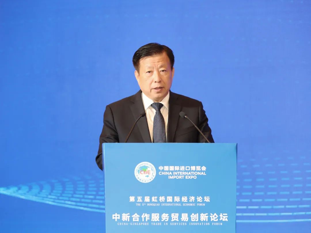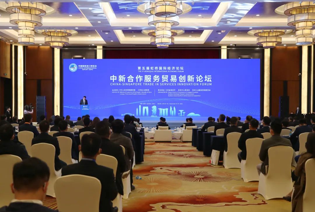 作为第五届中国国际进口博览会配套活动之一,今天,第五届中新合作服务贸易创新论坛在苏州工业园区举行。全国政协经济委员会副主任、国务院发展研究中心原党组书记马建堂,全国政协常委、民建中央副主席、上海市政协副主席周汉民出席活动并发表主旨演讲。商务部部长助理李飞视频致辞。省委常委、苏州市委书记曹路宝,副省长方伟,新加坡驻上海总领事蔡簦合现场致辞。省政府副秘书长黄澜,苏州市委副书记、市长吴庆文出席活动。