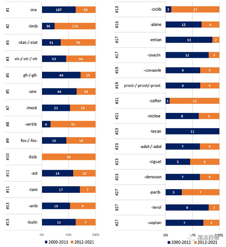 本文分析了2000年至2021年间的药物命名规律,发现一些化学结构的变化,如氟和杂环化合物的使用显著增加,分子量的逐渐增加,螺旋环支架和小环的增加,非传统结构的出现等,这些有可能预示药物的未来趋势。
