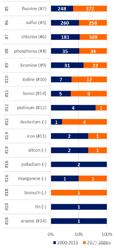 CHON之后,氟取代氯和硫成为CHON之后最常见的元素,30%以上化合物中含氟;