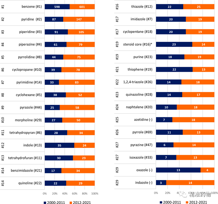 大多数含氮芳香环系统更多地出现在周期B中:吡啶、苯并咪唑和吡嗪增加了一倍,嘧啶几乎增加了三倍;吲唑尽管数量很少,但随着时间的推移正经历着显著的增加。这可能主要归因于酪氨酸激酶抑制剂(-tinib)的出现,它们的药效团中通常含有腺嘌呤模拟骨架。