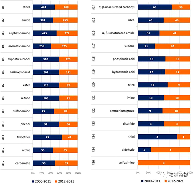 最常见的基团是醚键(N=962),其次是酰胺、内酰胺(N=840,42%)、脂肪族胺(伯胺、仲胺和叔胺;N=797,39%)和芳香胺(N=633,31%)。
