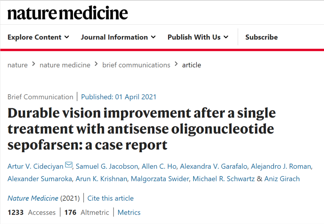 该RNA疗法是一种反义寡核苷酸,被称为Sepofarsen,最开始被设计用于治疗Leber先天性黑眼症(LCA)。这名患者具有基因CEP290突变,CEP290突变是LCA最常见的原因之一,CEP290突变会导致细胞产生CEP290蛋白,CEP290蛋白对眼睛的感光细胞至关重要。Sepofarsen能够进入靶细胞,指导细胞产生CEP290蛋白,以治疗LCA。