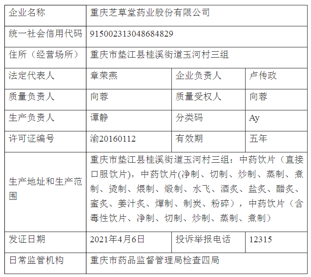 除此之外, 重庆世森医药科技有限公司和重庆芝草堂药业股份有限公司成功获批药品生产许可证,发证日期在4月6日,药监局于今日予以公示;其中重庆芝草堂药业股份有限公司为重新发证,具体属于到期换证情形。