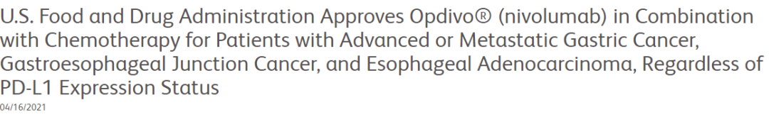 4月16日,百时美施贵宝宣布,美国FDA批准PD-1抑制剂Opdivo (纳武利尤单抗)与化疗联用,作为晚期或转移性胃癌、胃食管连接部(GEJ)癌和食管腺癌的初始治疗。这是FDA批准的首个一线治疗胃癌的免疫疗法。