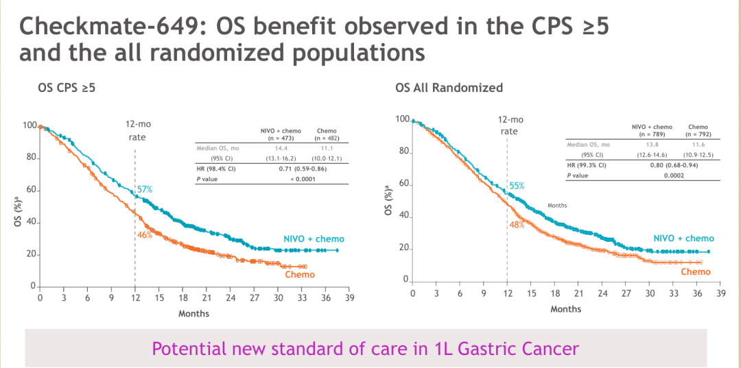 比,Opdivo联合化疗显著延长患者总生存期(OS)。在PD-L1阳性(CPS)≥5的主要分析人群(OS HR 0.71; 95% CI: 0.61 to 0.83; P<0.0001),以及所有随机人群(OS HR 0.80; 95% CI: 0.71 to 0.90; P=0.0002)中均观察到生存获益。