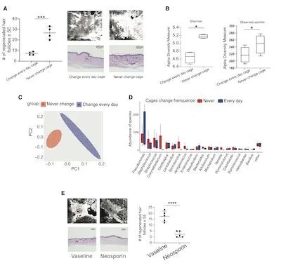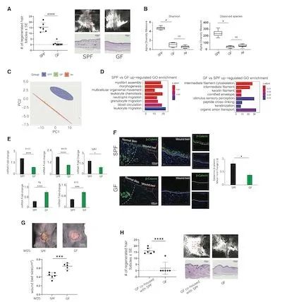 在这项研究中,作者重点关注了皮肤细菌对伤口炎症反应的促进作用,以及后者对伤口再生的调节。为此,作者使用了一种名为“损伤诱导毛发再生”的小鼠模型(WIHN)。首先,作者比较了SPF小鼠与GF小鼠其组织损伤再生的能力差异。结果表明,相比SPF小鼠,GF小鼠在接受WIHN诱导后,其再生能力明显较低。转录组学分析表明,SPF小鼠在损伤诱导后会出现免疫相关基因的高表达,同时伴随着角质化细胞分化相关基因的表达,然而这些基因在GF小鼠中的表达量相对更低。