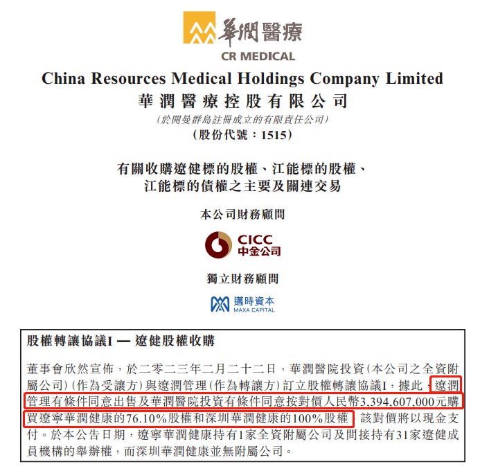公告显示,华润医疗全资附属公司华润医院投资拟以33.95亿元人民币从辽润管理手中购买辽宁华润健康的76.10%股权和深圳华润健康的100%股权。同时,华润医院投资拟以2.45亿元人民币从华润科技手中购买江能标的80%股权,以及购买华润科技对江能标的持有的债权(截至2022年12月31日,本金余额为3.17亿元人民币)。由于辽润管理及华润科技均由华润健康间接全资持有,而华润健康由公司控股股东中国华润间接全资持有。因此,上述两笔收购属于同系收购,收购款共计约36.39亿元人民币。