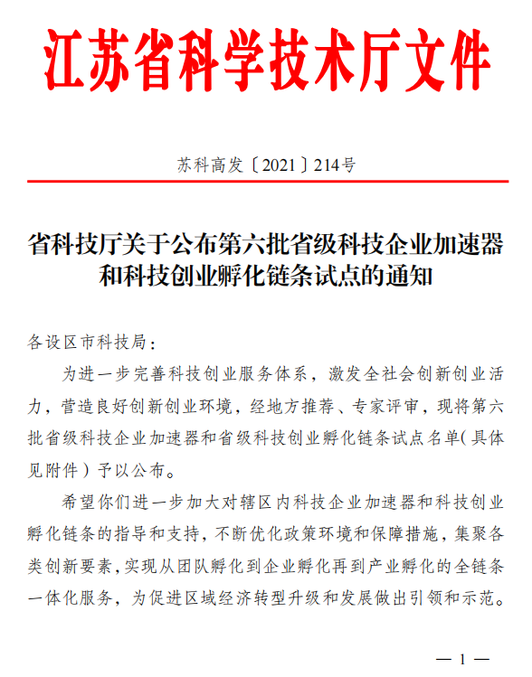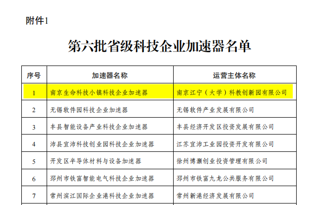 近日,江苏省科学技术厅公布了第六批省级科技企业加速器和科技创业孵化链条试点的评审认定结果,全省共有15家加速器和5家孵化链条入选。由江宁高新区南京江宁(大学)科教创新园有限公司运营的“南京生命科技小镇科技企业加速器”和“南京生命科技小镇科技创业孵化链条”位列其中,成为此轮评审中南京市唯一一家获此荣誉的单位。